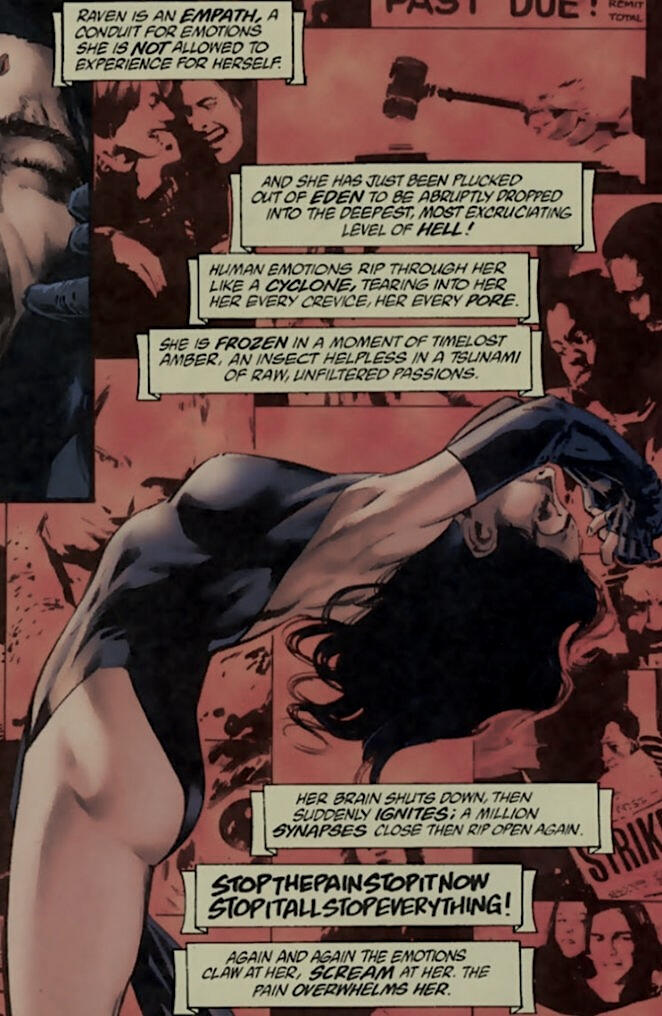 Her tone is usually flat, her words usually blunt. When she does elaborate, her vocabulary is sophisitcated and wise beyond her years. Raised by Azar as royalty among Azarathian pacifists, she still carries an innate elegance that survived New York, and even now survives in Gotham.Her stoicism is not necessarily a lack of feeling, but it's a self-built wall. Her emotions must be contained behind a mask of absolute coldness. A lack of control on them could lead to disaster due to her powers being primarily dictated by intense feelings.
